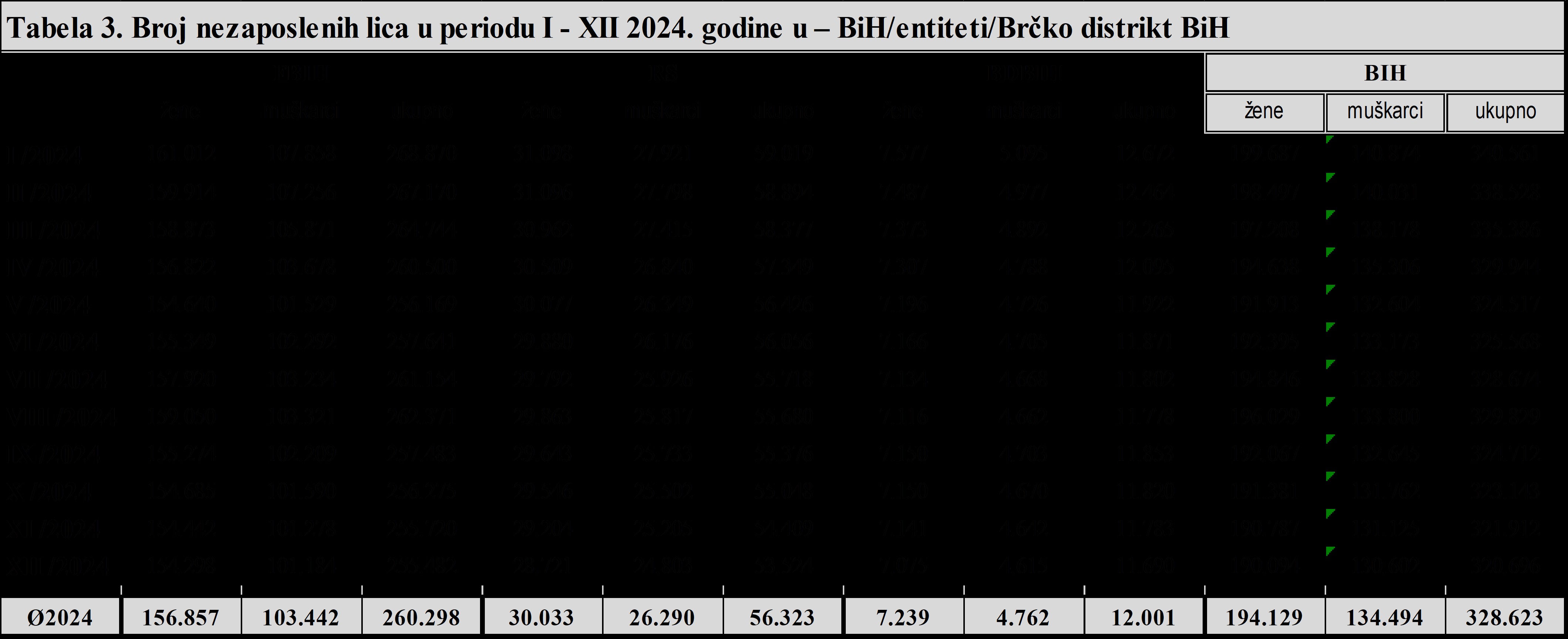 Prosječan broj nezaposlenih lica u 2024. godini iznosio je 328.623 i u odnosu na prosjek u 2023. godini smanjio se za 20.295 ili 5,8%. Od ukupnog broja lica koja traže zaposlenje u 2024. godini, 194.129 ili 59,1% su činile žene. Poredeći stanje u entitetima i Brčko distriktu BiH